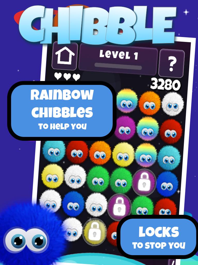 Chibbles are cute and fluffy little aliens from Betelgeuse that have been stranded on Earth. Your challenge is to match 3 or more Chibbles of the same colour to beam them back home.